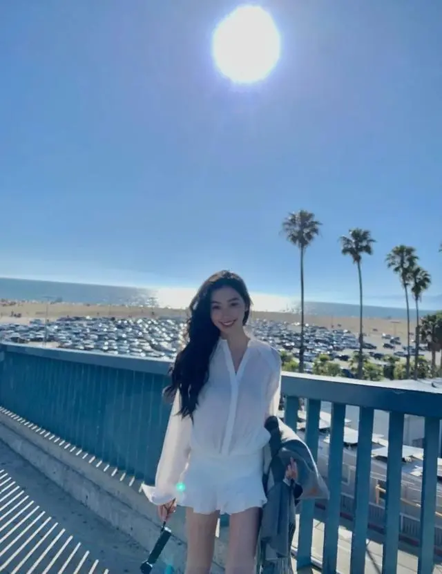 玲身着白色衬衫及荷叶边短裙,整个造型在光的照射下散发波光,漫步在海边之时,整个人融入到海天之色中,飘逸的裙摆尽显浪漫。