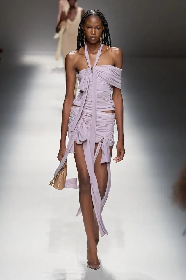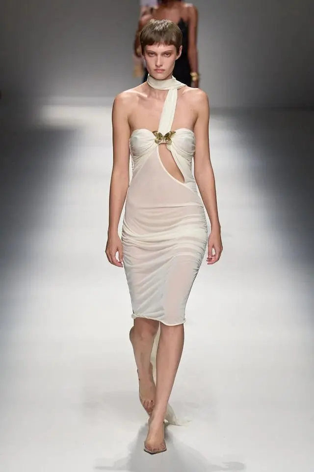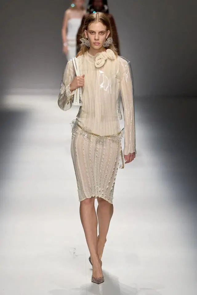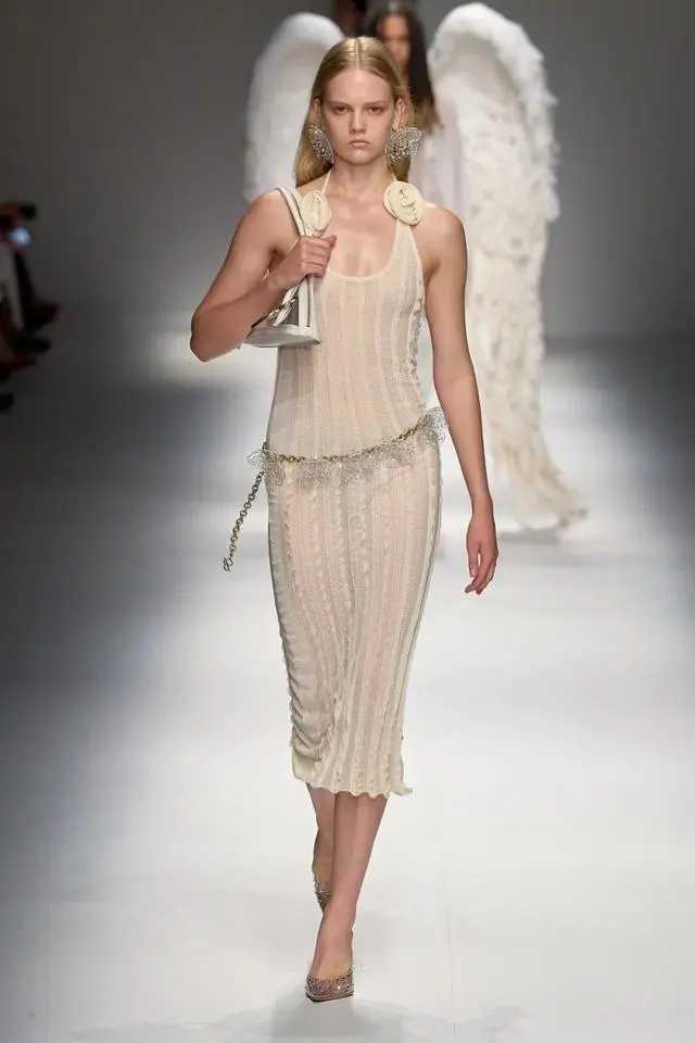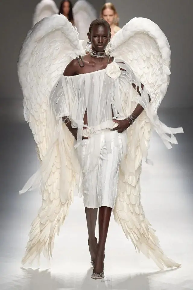 Blumarine 2024春夏系列让人仿佛置身于浪漫又具有神秘色彩的世界当中,引入眼帘的是在古希腊神话中才能见到的高贵而又神秘的天使。薄纱面料下映照着若隐若现的皮肤,走路时飘逸的裙摆,散落的飘带,都为本次秀场营造出一种空灵的氛围。当神秘的翅膀和高透肤的服饰相互映衬时,整个系列弥漫出一股神秘浪漫的气息。