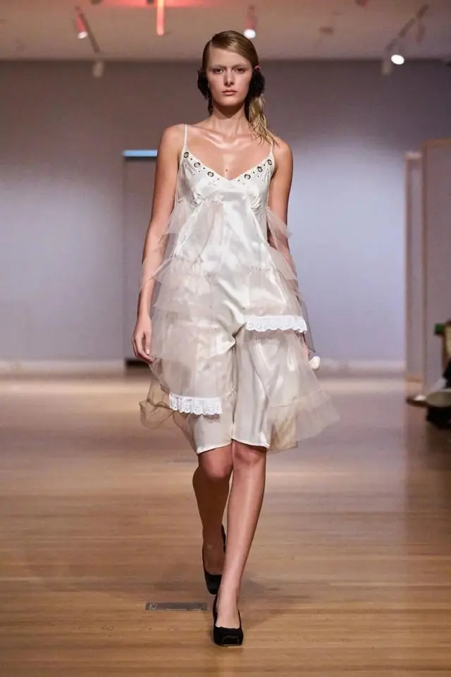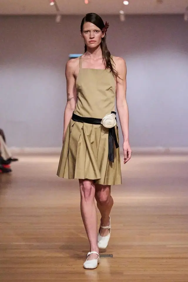 区别于Balmain中赋予女性的力量感,Sandy Liang 2024春夏系列中少女的形象就更显稚嫩一些。本季设计以美国导演 Sofia Coppola 的第一部作品《The Virgin Suicides》中演员们的服装造型作为灵感。极具女性气质的梦幻镜头,让蕾丝在本季设计中成为了不可或缺的元素之一,但在这些蕾丝设计中夹杂着的是一些个性与叛逆,千禧风格的服装更是在本次的系列中有全新的展现,主打一个浪漫与个性并存。