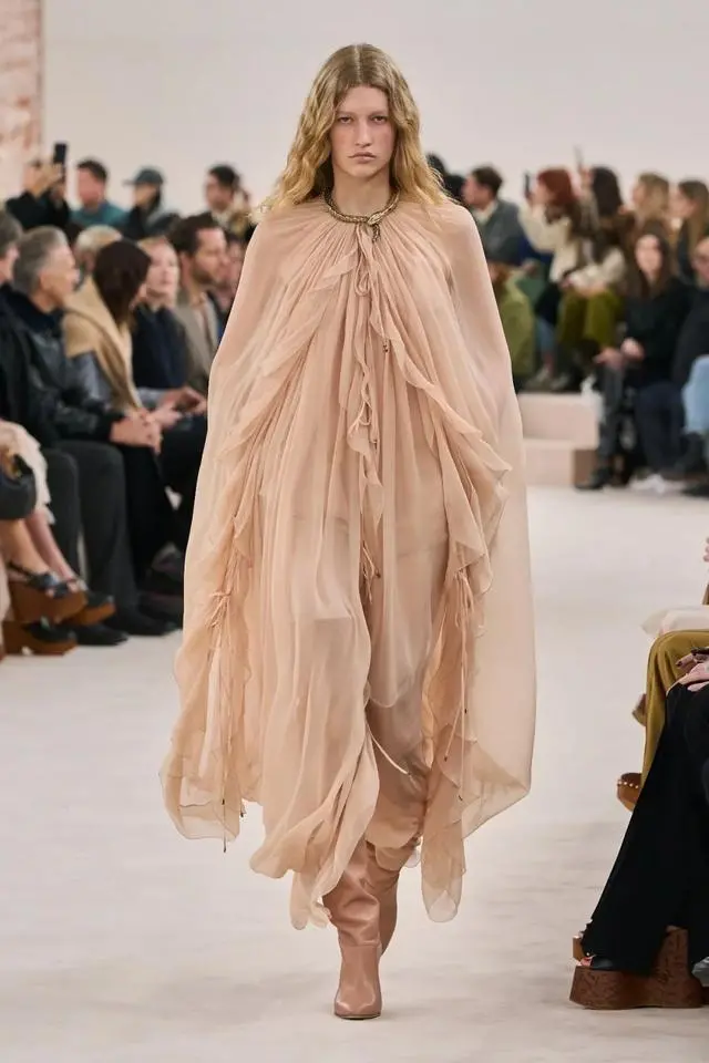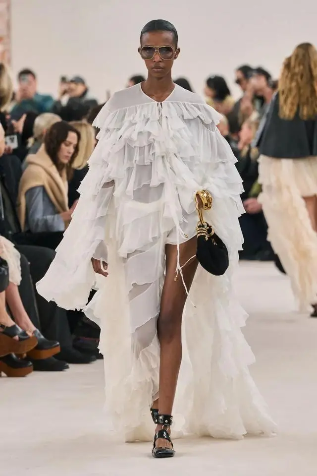 Chloé 2024春夏系列是一次对于环保的呼吁,以自然界中的植物作为主要的灵感来源,借用百合花、兰花和其他花卉表达对于自然界的热爱。花朵是一种意识的象征,而本次也在廓形上看到了一些飘逸感,薄纱面料堆砌的花朵和荷叶边,都为本季带来了一些来自自然界中生长的灵动。