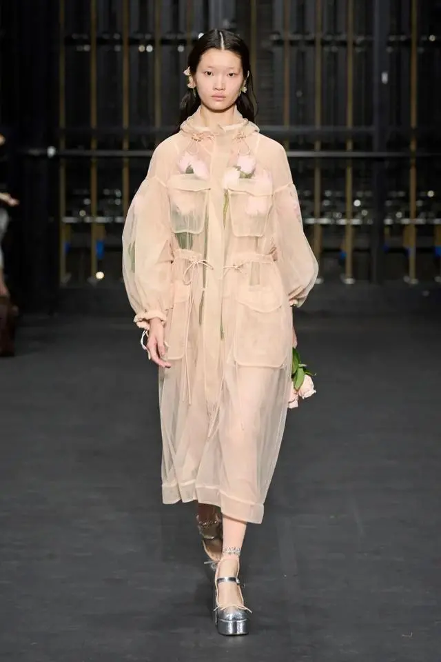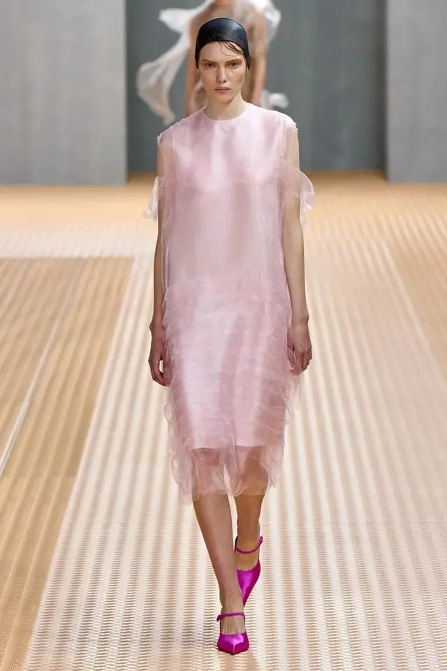 在T台上,模特身穿Prada 2024春夏系列步伐轻盈,整个造型似水光流动。本季最大的亮点之一是将欧根纱裙结合透明织物,营造出一种轻盈灵动之感,在透明面料的映衬下,肌肤若隐若现,同时还带着一些神秘感,将女性独有的柔美毫不保留地展示出来。