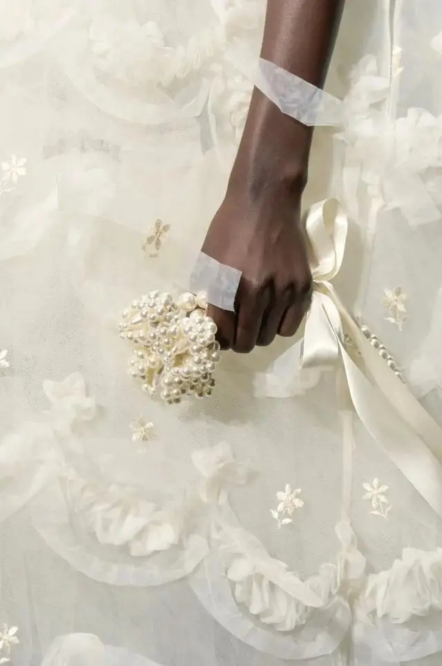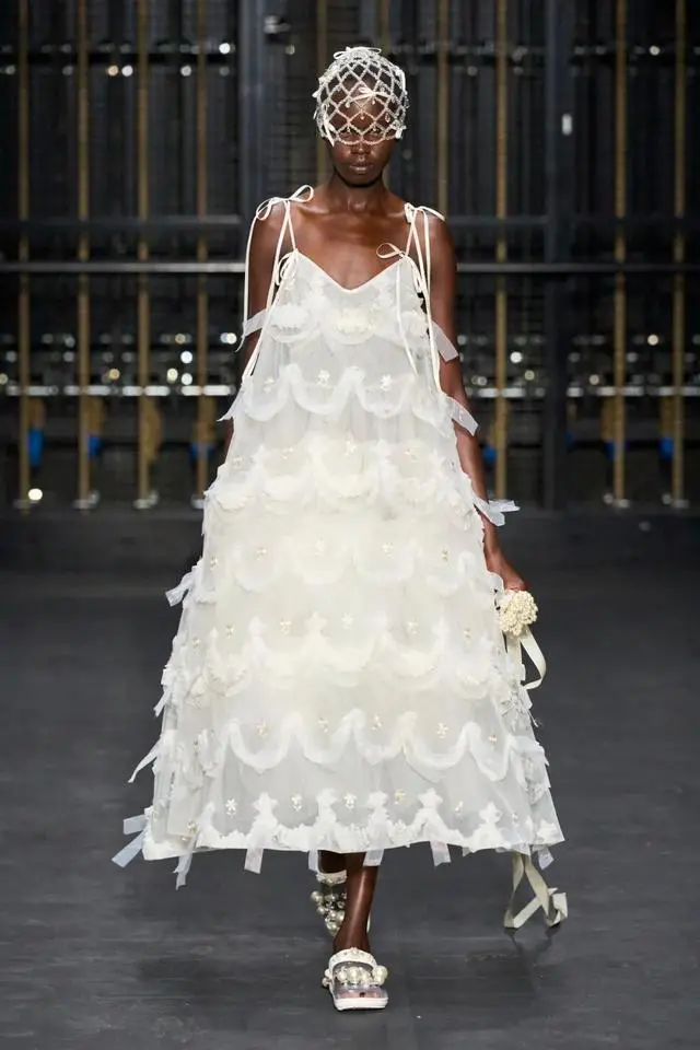 Simone Rocha 2024春夏系列也将“浪漫”进行到底,此次的秀场再次向观众展示了一个梦幻的世界。本系列多采用薄纱面料,薄纱以一种飘逸的方式运用在整个系列的设计当中去,褶皱元素、镂空钩花、丝带等与薄纱结合在一起时,灵动的飘逸感给人一种似真似假的错觉。玫瑰花也是本季设计中不可忽略的一部分,在薄纱的遮盖下,绽放的粉色花朵亦如少女纯净的内心,优雅中略带俏皮。