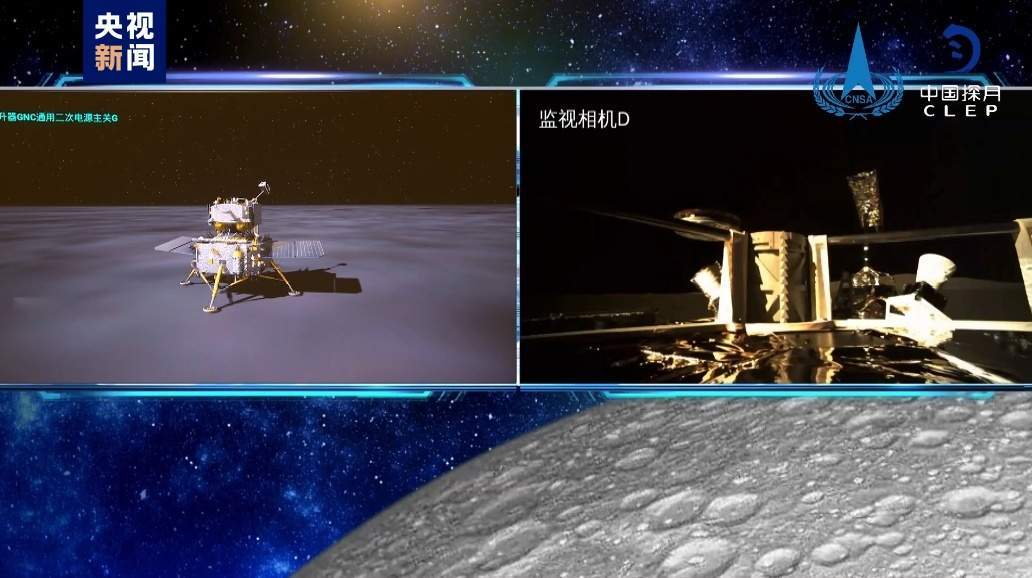 北京航天飞行控制中心荣志飞:这个是月面起飞的上升器,着陆器就留在了月背上。这个月面起飞,就相当于在月球完成一次发射,不过它与地面发射不同的是,月面起飞不具备成熟的发射塔架系统。
