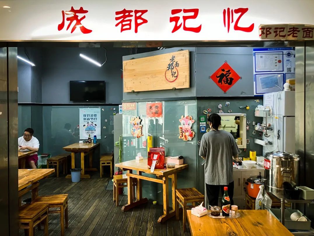 邓记老面像此中的模块,镶嵌在一栋的三层楼,竟也在楼内摆起了露天桌椅。相邻的不是美发,就是宠物店,这味道的复杂程度可想而知。上一波午餐的食客刚撤退,背景音是隔壁店里小狗的吠叫。厨房墙上贴着大字:免费加面。