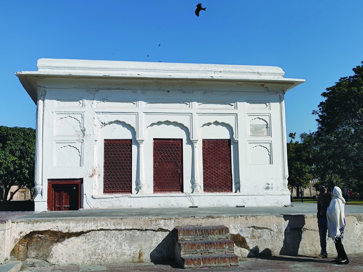 回到地面,记者一行继续参观小屋的地上部分。四面都是石雕屏风贾利,显然这也是为了通风、凉快。天花板上则与瑙·尼哈尔·辛格别墅顶楼的镜面装饰一致,这个小屋似乎也可以被称作小“镜宫”。