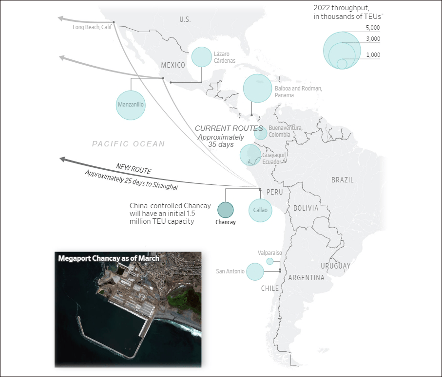 钱凯港位于秘鲁首都利马以北约80公里处,竣工后将大幅提高运力(《华尔街日报》制图)