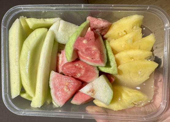 酸嘢里的水果,用盐糖水泡过,闻着甜,吃起来却是咸甜口,感觉不像在吃水果,更像是在吃水果罐头。