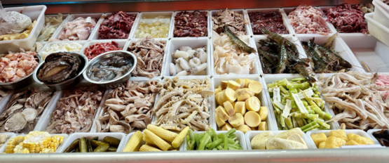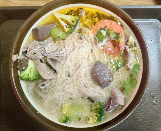 点捞化,感觉好像是在点麻辣烫。粉和食材都根据个人偏好,自由选择。第一次站在捞化店面前的我,看着那一排排不同种类的海鲜、肉类和蔬菜,显得茫然又无措,不停内心OS:“那大虾、那鱼片、那鲍鱼,就这么直接放粉里吗?OMG,会不会太奢侈了些,这是真·海鲜粉啊!”