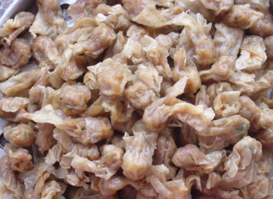 肉燕皮,是将猪肉捶打成猪肉茸,再加入木薯粉,经过拍、赶、点等十多道工序,得到看似“面皮”的白色肉燕皮,再用它来包猪肉馅。因为这层特殊的皮,肉燕吃起来有一种脆啾啾,QQ弹弹的感觉。再撒上胡椒粉和麻油,那叫一个香啊!