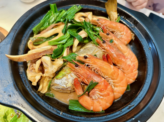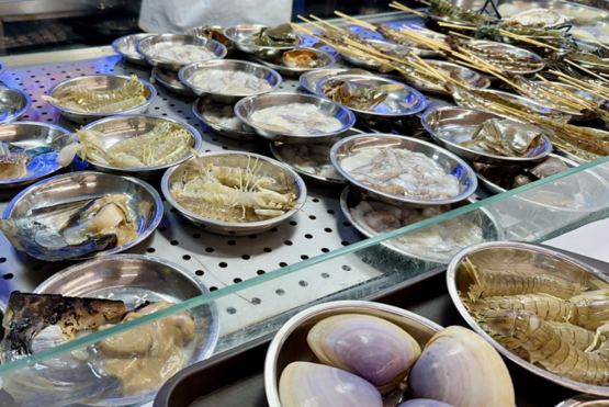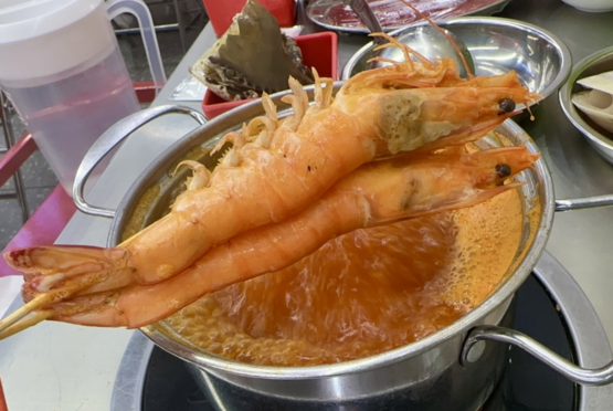 火锅都是一人一个的小锅,可以根据自己的喜好,选择番茄锅、米汤锅、花胶鸡味锅等。海鲜种类很多,罗氏虾、黑虎虾、皮皮虾、墨鱼仔、海蚌、生蚝等。我个人最喜欢虾,真的很鲜甜!
