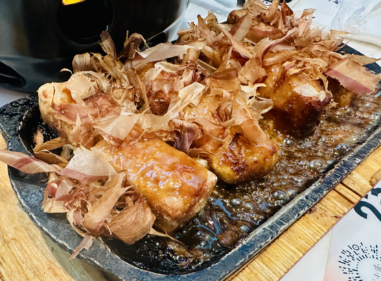 至于会跳舞的芋头,外皮酥脆,里面的芋泥香甜,上面撒着一层柴鱼花,裹着章鱼小丸子的酱汁。与其说是一道菜,吃起来更像是甜点或是小吃~