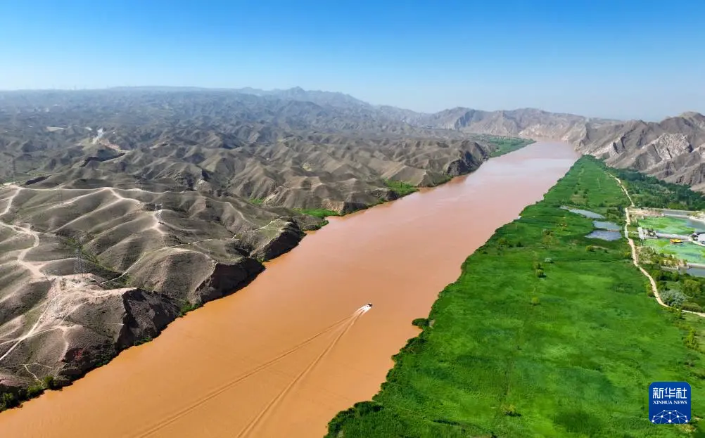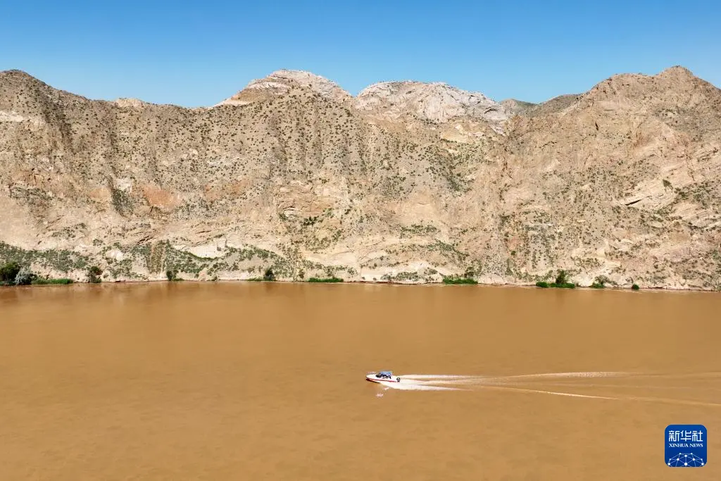 一艘快艇行驶在位于宁夏回族自治区吴忠市青铜峡境内的黄河宁夏段(6月23日摄,无人机照片)。
