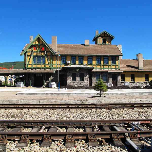 阿尔山站建于1937年,是日本关东军驻扎时期的产物,至今仍保存完好。这里是白阿线的终点站,夕阳下火车进站时,站台上笼罩着一层暖意洋洋的金光,明丽暖人的色彩,干净简洁的站台,令人不禁怀疑是否来到了瑞士的乡村小镇。这幢东洋风格的低檐尖顶二层日式建筑,历经战火和历史变迁,依然风雨不改地迎来送往,张开怀抱拥抱每一个旅者。它的美凝聚了时间的香醇,小而精致,令人心醉。