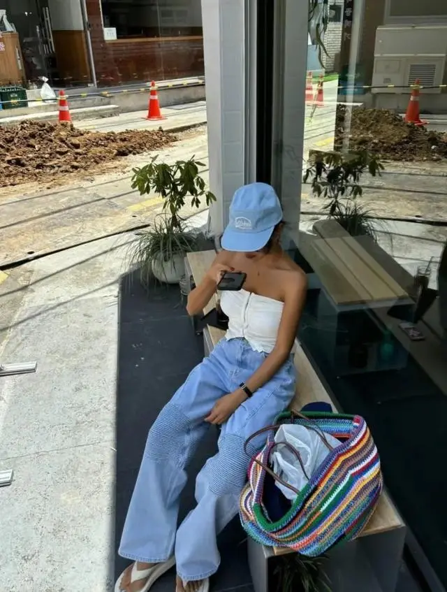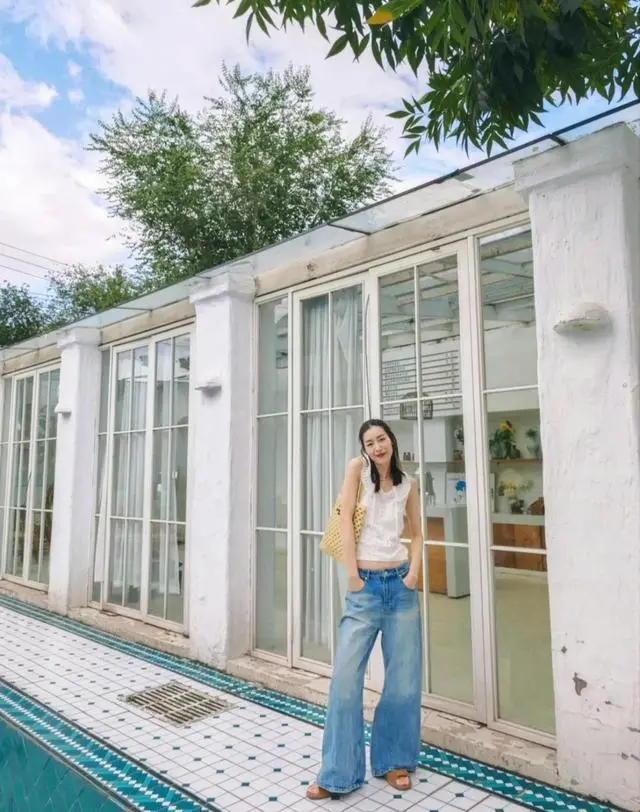 刘雯在休息时,选择的就更加简单一些,一件白色碎花荷叶领上衣搭配一条浅色的牛仔裤和浅色的编织包袋,整个风格简单干净,又极具舒适感。可以说牛仔裤就是刘雯的舒适区,任何风格都可以通过一条蓝色的牛仔裤轻松完成时尚感。