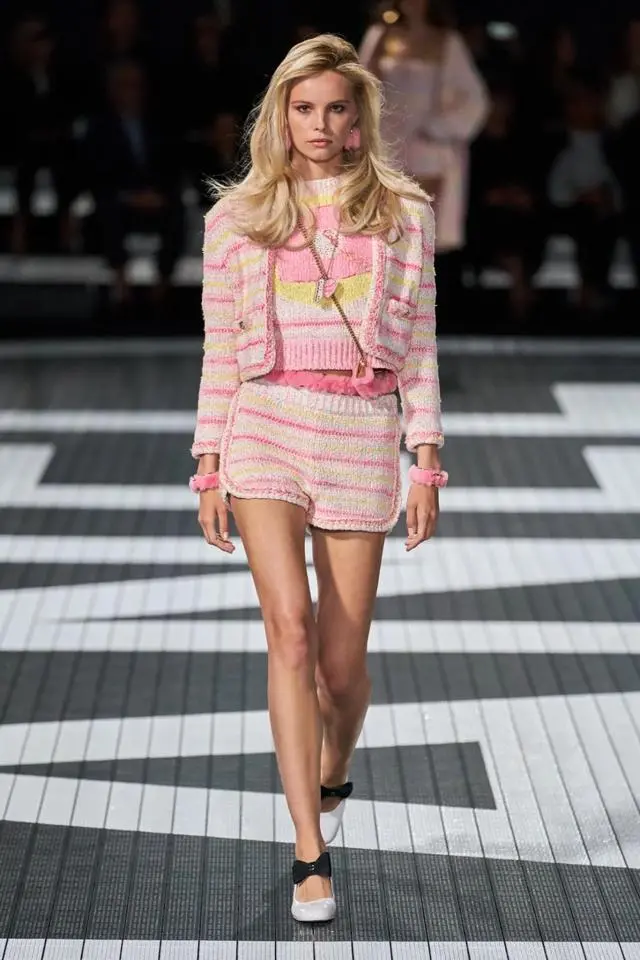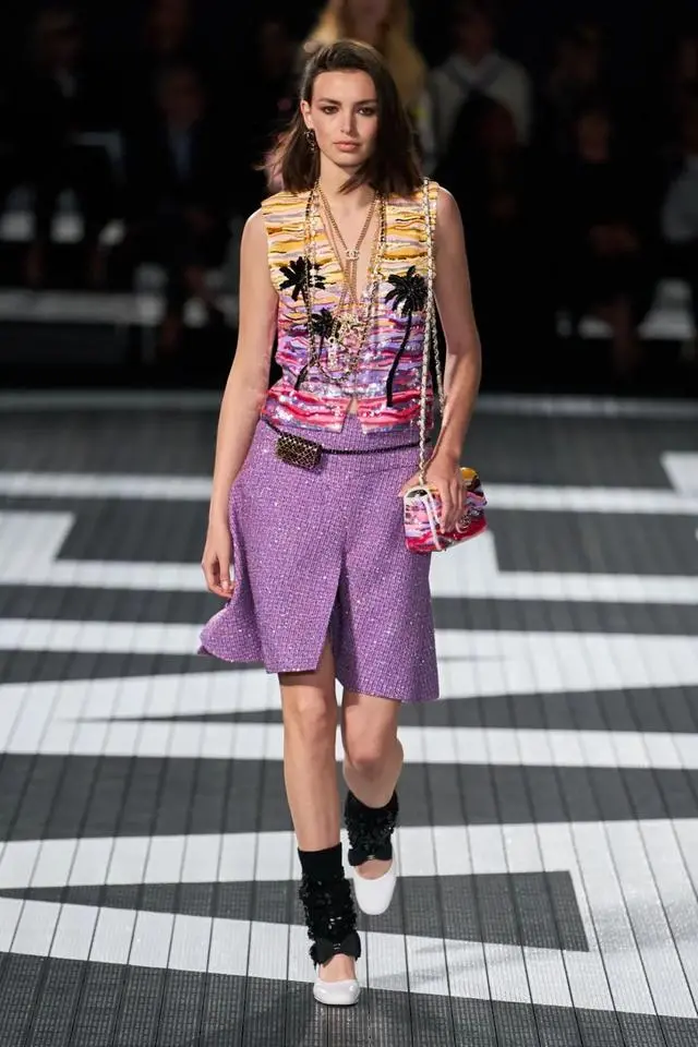 早在度假系列开创出一番新天地的CHANEL 在2024早春度假系列中,将灵感来源聚焦于洛杉矶的生活文化与昔日好莱坞明星的魅力之上。海上漫天橘红色的落日和沙滩上矗立的棕榈树被创意总监 Virginie Viard全数复刻在了服饰之上,用钉珠、亮片和贴片的方式还原了一场盛大的海上落日,夕阳余晖和波光粼粼的水面美得让人离不开视线。