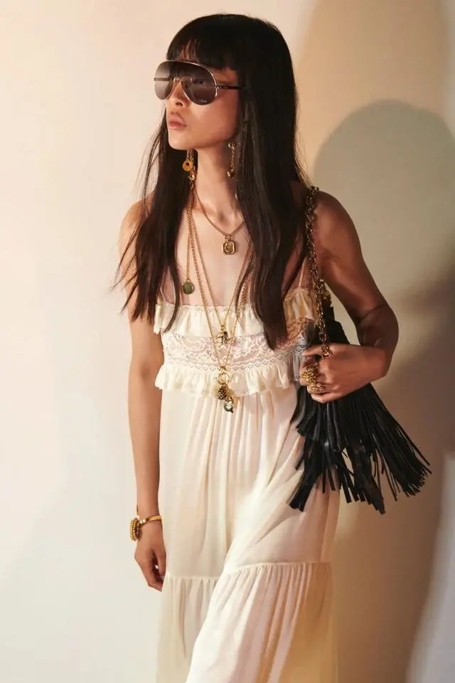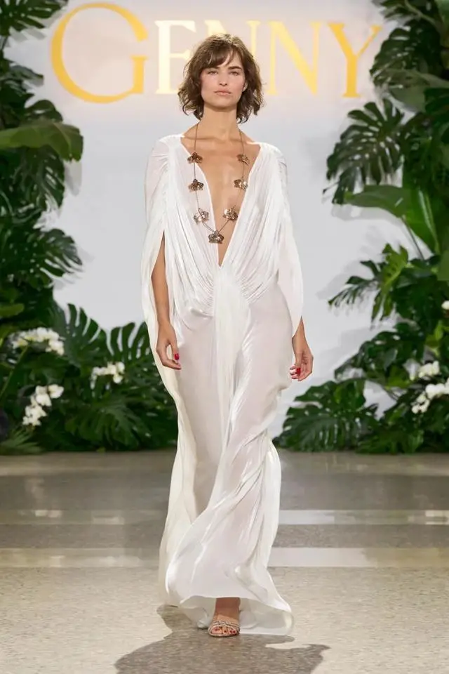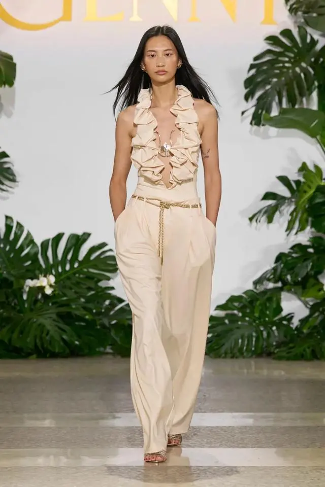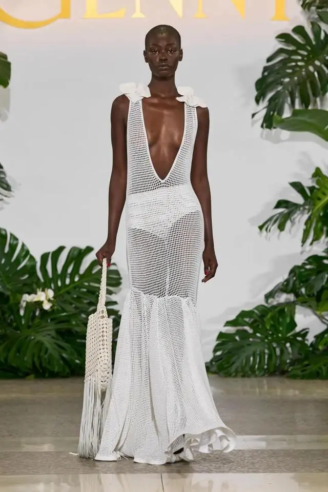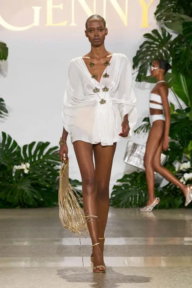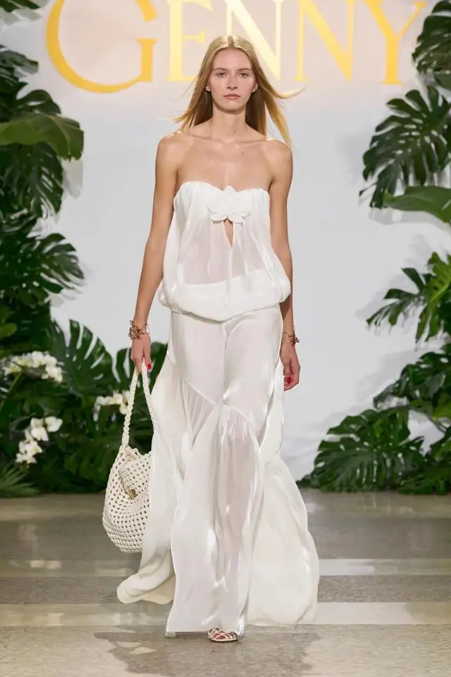 GENNY 2024春夏系列是都市度假风的代表,将简约大气和优雅性感的气质展露无疑。认真观察,会注意到花朵和流苏等元素附着于服饰之上。这些度假风格的元素和都市摩登的版型结合在一起并不违和,反而区别于传统既定的两种风格,从而达到了一种完美的平衡感。