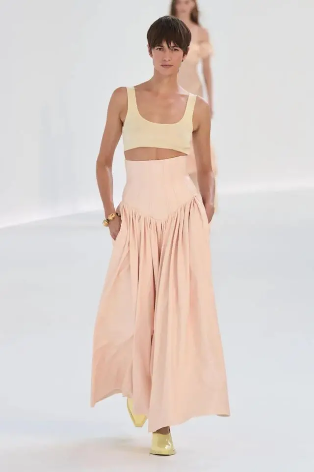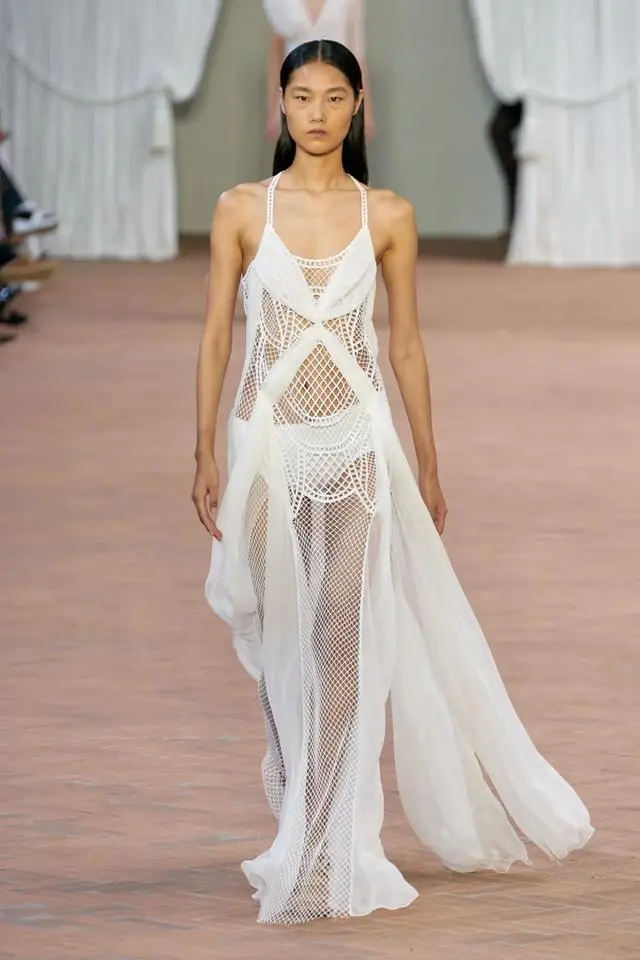 ALBERTA FERRETTI 2024春夏系列少了一些礼服的设计特点,更多的是参考到了一些非正式场合的着装偏好,将之前大量采用的雪纺面料与薄纱换成了编织与条纹面料,展现了古希腊的美与现代设计的碰撞,可以同时兼顾各种场合。