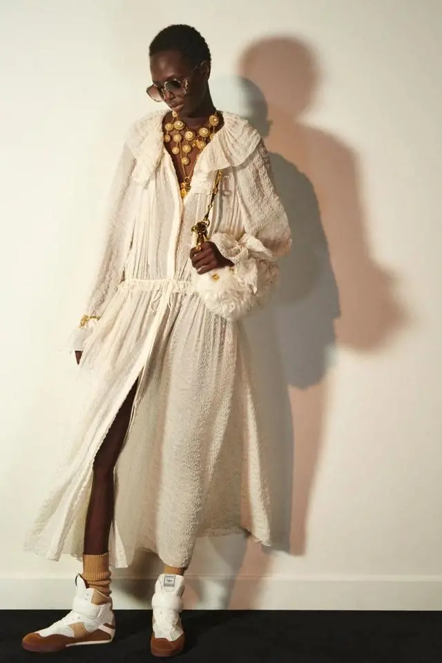 CHLOÉ 2025早春度假系列以Karl Lagerfeld 1970年代的公寓为灵感来源,有趣的是这个公寓处于圣叙尔比斯教堂中,经典的黑金色和奶油色的色调成为了本系列的主要色彩。创意总监 Chemena Kamali将装饰艺术的华美韵致和1960年代末的时尚风潮结合在一起,呈现出了一系列以装饰艺术图案和配色创新的复古单品,回顾以往风采。