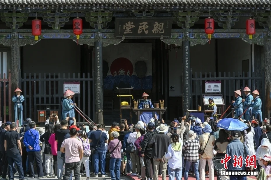 近年来,平遥古城各景点立足自身特点不断推出承载传统文化的体验项目,让游客在平遥古城观看演艺表演、自己书写汇票、学习剪纸艺术、制作手工月饼等,在时空穿越中读历史、品文化。图为平遥古城县衙景区,工作人员正在为游客表演县太爷“巧断盗银案”,俏皮诙谐的表演吸引了众多游客。图/视觉中国