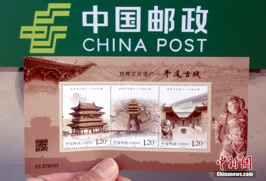 2023年12月3日,中国邮政发行《世界文化遗产——平遥古城》特种邮票1套3枚、小全张1枚,邮票图案名称分别为迎薰门、南大街、日昇昌旧址。全套邮票面值3.60元,小全张售价5.40元。图/视觉中国