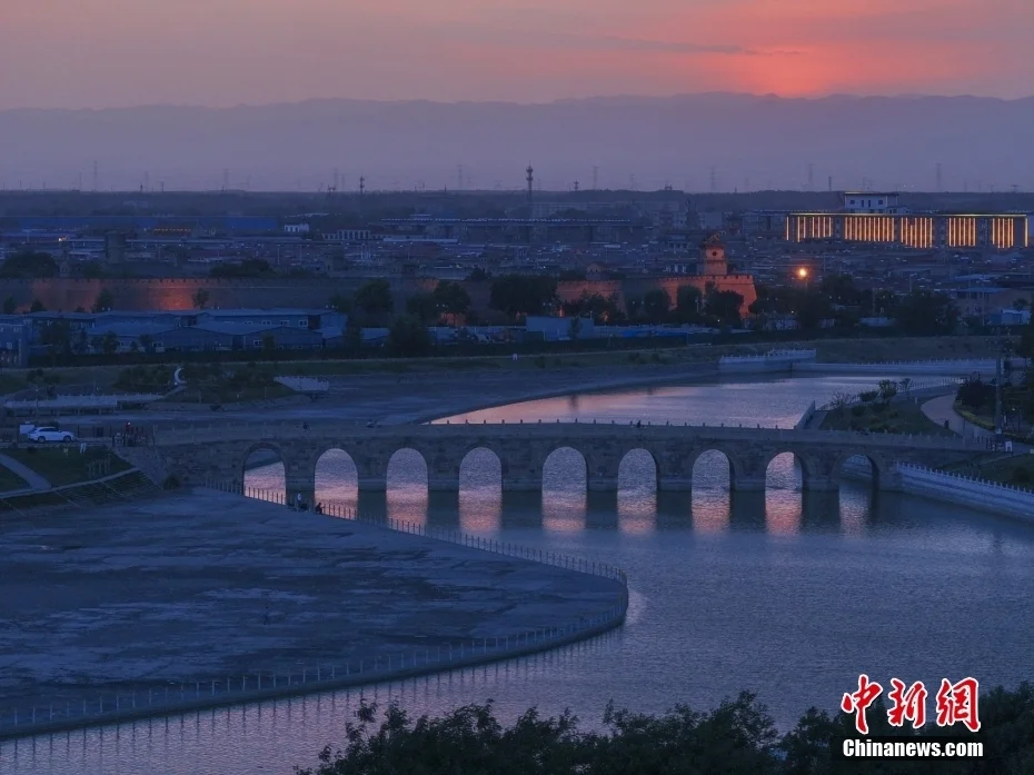 晚霞辉映的平遥县惠济桥,宁静祥和,与平遥古城隔河相望,构成一幅美丽画卷。图/视觉中国