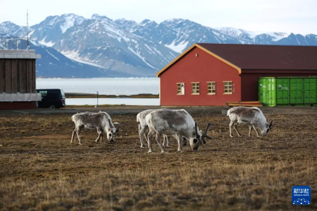 6月20日,驯鹿在挪威新奥勒松小镇上吃草。