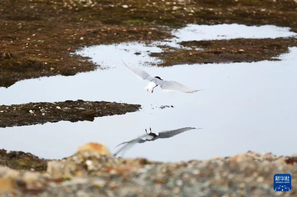 6月20日,在挪威新奥勒松,一只北极燕鸥从水面上飞过。