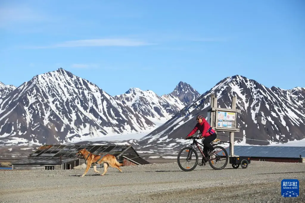 6月21日,一名女子骑车从挪威新奥勒松小镇上经过。