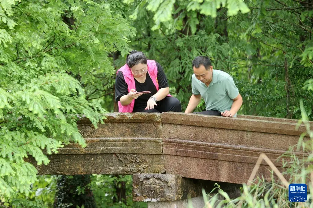 6月27日,在德清县阜溪街道龙胜村,村级文保员对兼济桥进行日常巡查。