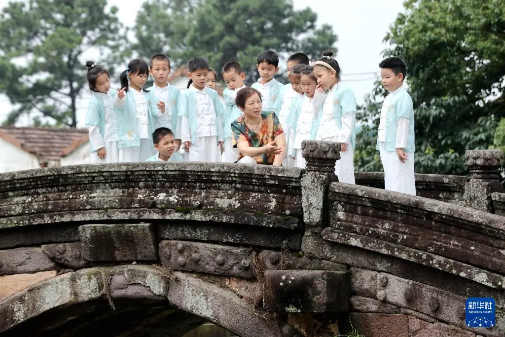 6月26日,在德清县新安镇舍北村,文化志愿者给孩子们讲述万善桥的历史知识。