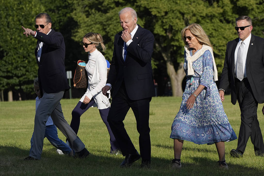 当地时间2024年7月1日,美国总统拜登与妻子吉尔·拜登、儿子亨特·拜登等家属从马里兰州戴维营返回华盛顿特区,抵达麦克奈堡基地。(视觉中国)