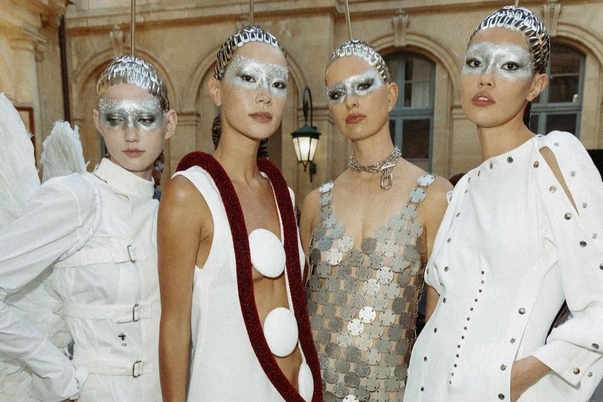 随着1960年代人类首次登月,太空从遥不可及的存在成为时尚、艺术和电影创作中无法被忽视的热门题材。Pat McGrath在模特脸上设计了大片闪耀银色,如同太空眼镜;而不规则分布的钻石不仅加强了金属质感,也重现了人类对月球的初印象。