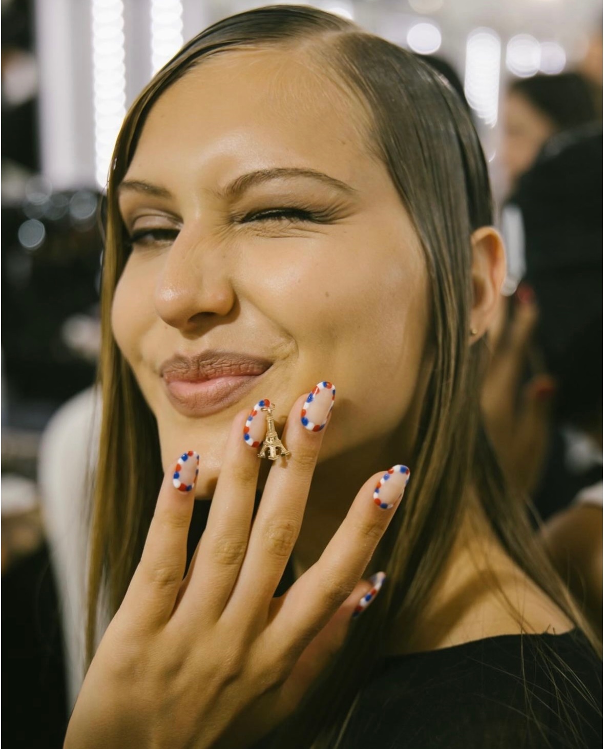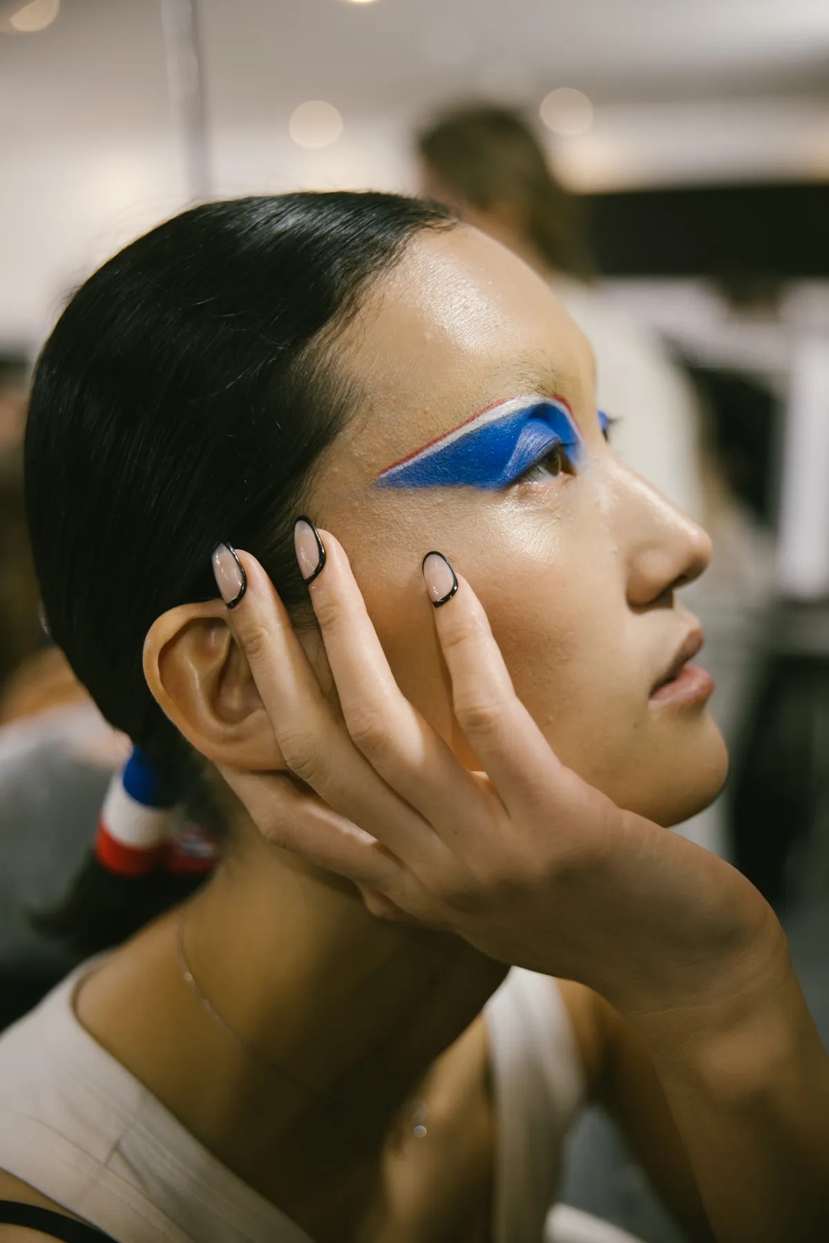 二战后的女性开始重新拥抱女性化,Christian Dior带来强调腰线的套装,New Look廓形主宰了1950年代的时尚新风貌。在妆容上,Pat McGrath使用来自法国国旗的红白蓝三色致敬这个全新时代,自由大胆的色彩搭配和犀利上扬的轮廓感,重现1950年时尚态度。