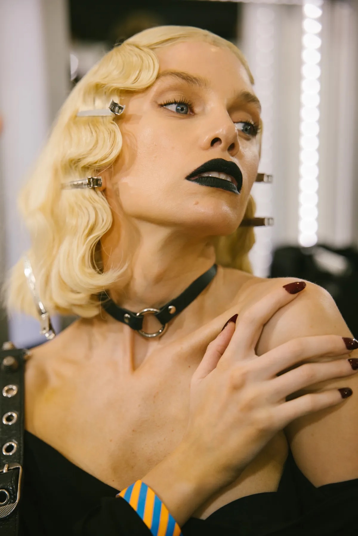 1980年代,女性开始在各方面强调力量感,轮廓感、线条和体积感成为这一时期风靡的时装元素。Pat McGrath从极具反叛精神的1980年代时尚Icon Grace Jones的标志性妆容出发,为模特设计了色彩分明、线条感突出的妆容,强调前卫和戏剧化。