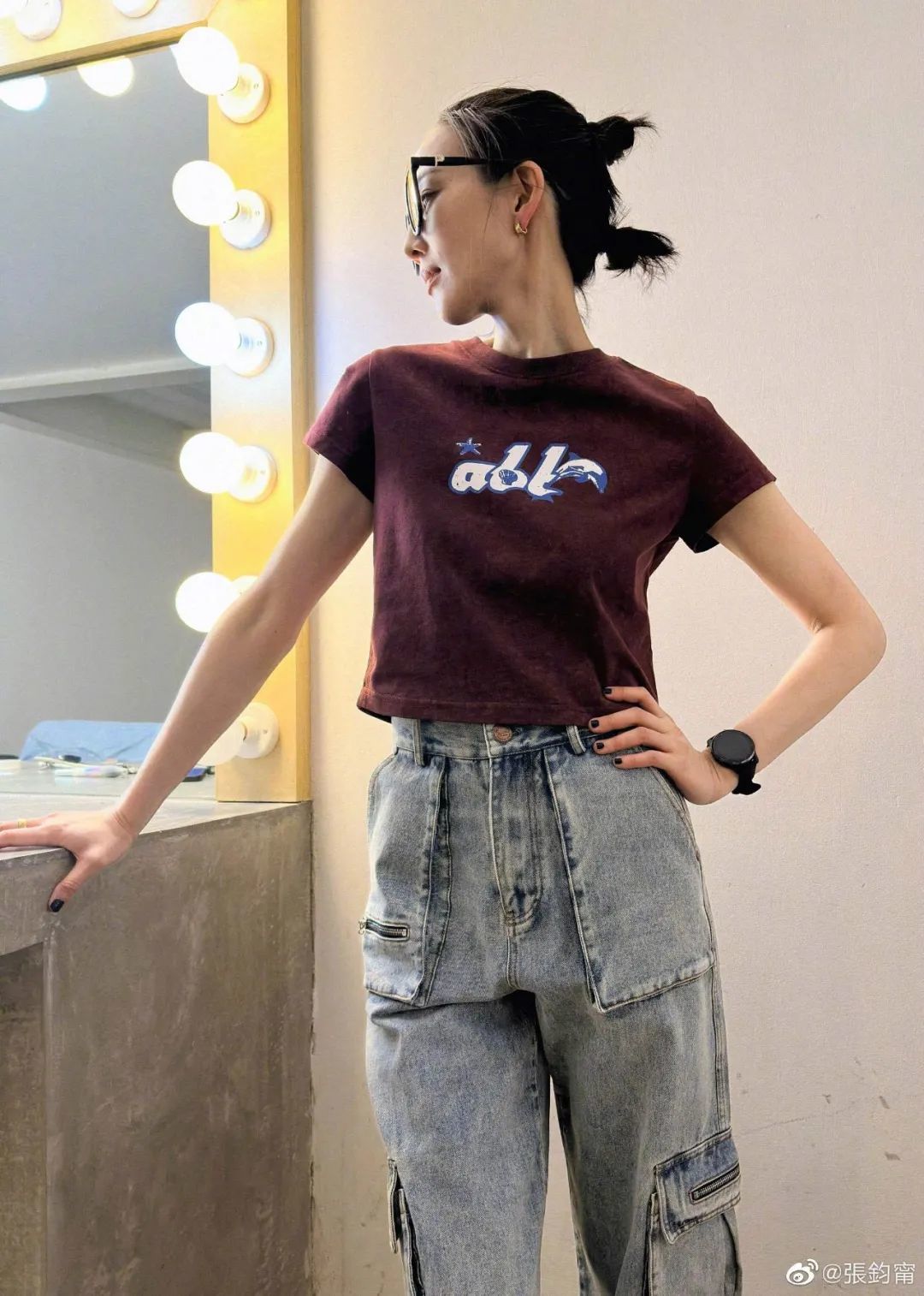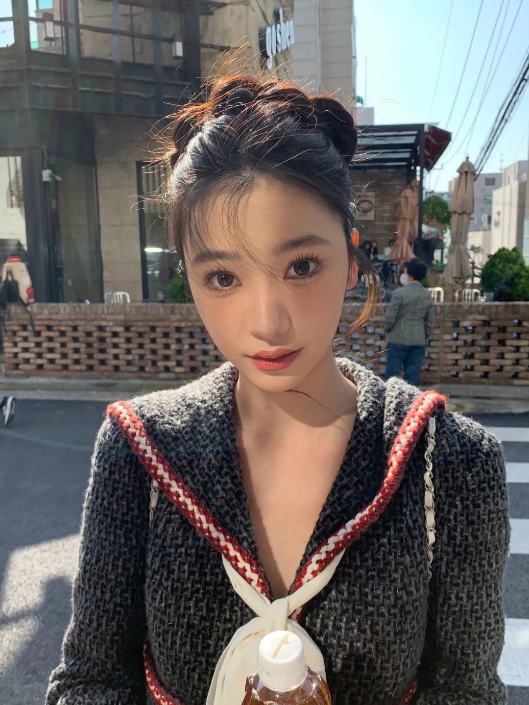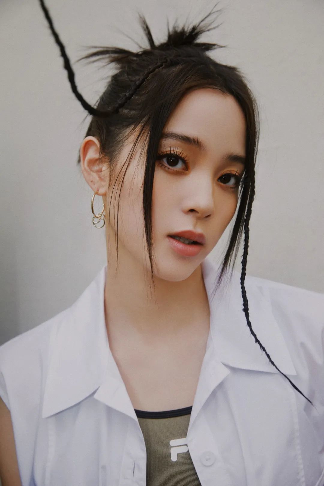 从去年夏天火到今年的牛仔辣妹造型也是鞠婧祎的一个代表作,她在双侧低丸子头的基础上增加了辫子和金属装饰等元素,火速出圈。今年换成了高丸子,还增加了小发卡和龙须刘海辫,预计又出现大批博主出模仿教程。