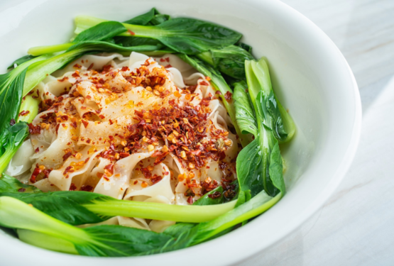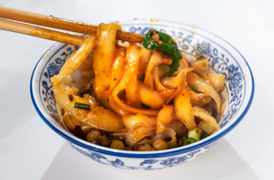 油泼面要够宽,这是件极考验面安师傅手上功夫的事情,宽而不硬,筋而不僵是最基本的要求。不仅面太细会落了下乘,就连弹性不够也会遭人耻笑。