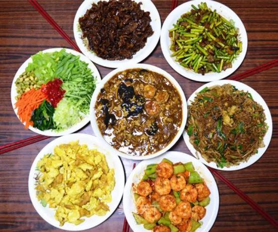 四碟炒菜是炒合菜、香干肉丝、黄瓜虾仁或是醋溜鱼片、糖醋面筋。