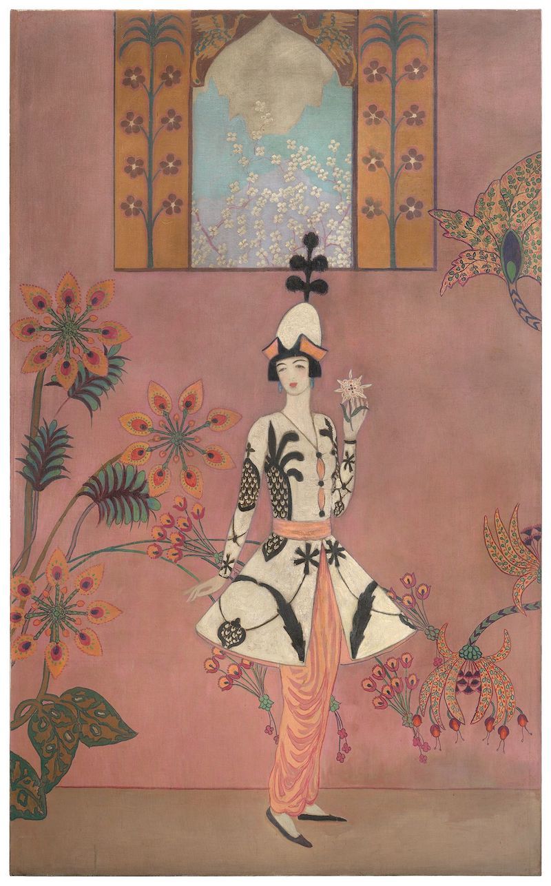 范德比尔特家族的格特鲁德也是首屈一指的业余舞者。在巴黎时,她与俄罗斯芭蕾舞团密切接触,穿上俄国舞台设计师莱昂·巴克斯特为歌剧《恶之花》设计的戏服。波斯风格外套、哈伦灯笼裤(Harem Pants)和奥斯曼式帽子,让她在伊斯兰风格窗户与波斯花园背景下,释放随性身姿和自由个性。