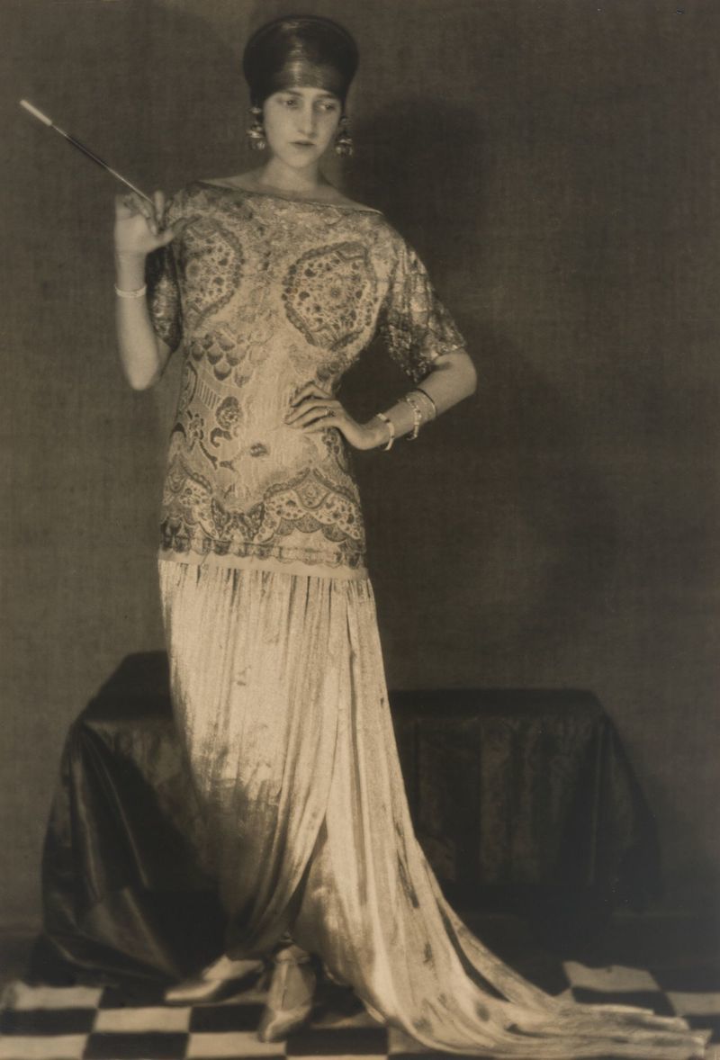 古根海姆家族的佩姬·古根海姆(Peggy Guggenheim)逃离了纽约曼哈顿的家庭,1921年前往巴黎开始新生活。在摄影师曼·雷(Man Ray)的时装片中,她头戴埃及式金色头巾和大坠耳环,身穿异域风格的拖地礼服,手持长烟管,极富个人风格。