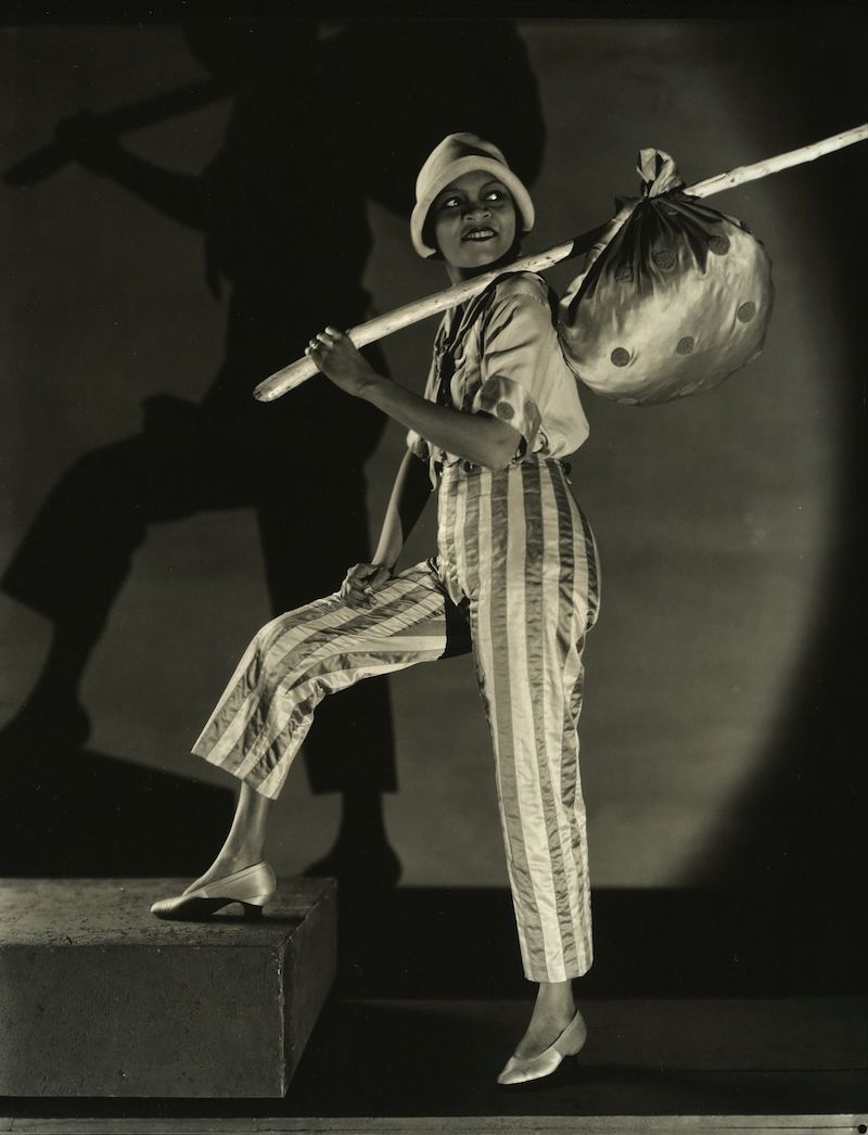 与约瑟芬•贝克齐名的舞者弗洛伦斯•缪斯(Florence Mills)风靡20世纪20年代的巴黎,法国评论界称她为“小黑鸟”。在著名摄影师爱德华·史泰钦的照片中,她身穿粗条纹长裤,头戴钟形帽,扮演活泼俏皮的男孩形象,肩膀扛着的布兜和登上台阶的右腿,在光影中呈现人体力量感。