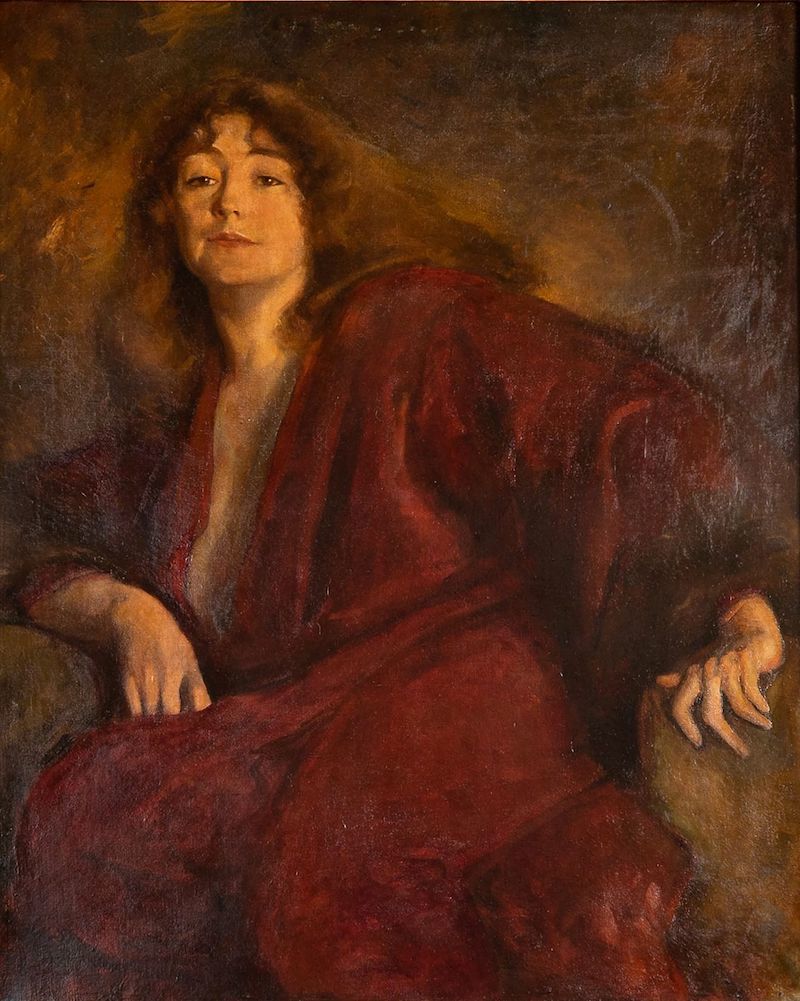 美国画家罗斯·奥尼尔(Rose O’Neill)是世界上首位通过艺术创作实现财富自由的女性之一。她创作的丘比特(Kewpie)卡通形象,在20世纪初为她赚取百万财富,成为女性富豪。1906年,罗斯在巴黎开办首个画展,展出关于神话与进化理论概念的作品。她批判束胸服是对女性身体的迫害,1915年,她谎称自己怀孕,说服裁缝为她制作了一件解除束胸的宽大酒红色长袍,请画家莉莉安·汤普森(Lillian Fisk Thompson)为穿着这件衣服的她画肖像画,画中的她体态松弛,神态自如,充满自信。
