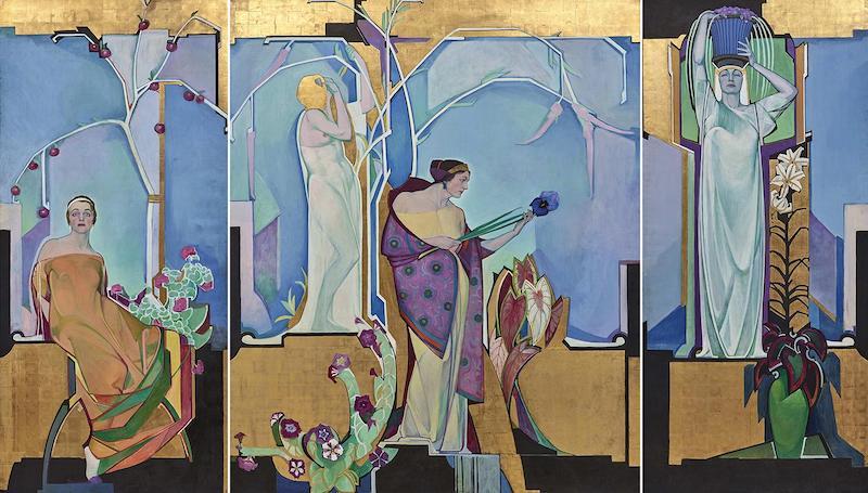 美国与法国文艺界双向互动,有从美国流入巴黎的艺术家,也有欧洲迁往美国的天才。画家、摄影师爱德华·史泰钦(Edward Steichen)是生于卢森堡、移居美国的移民。他的《高举之花》组画是为阿格尼丝·额内斯特·梅耶的曼哈顿公寓绘制。在这个有维也纳分离派风格的三重幻想式花园中,三位女性分别扮演玫瑰-天竺葵、矮牵牛-贝母叶、金边百合-紫罗兰,希腊式长袍、浴巾和披肩,结合蓝、紫、金黄的色彩,表现女性的优美。