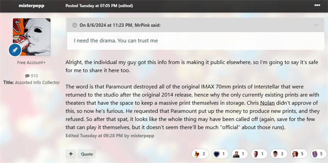 据该帖称,早在2014年首轮放映后,派拉蒙就将放映完毕后的原始胶片拷贝进行了销毁,目前只有少数还存放着胶片拷贝的影院具备放映能力。而影片导演诺兰起初并不知道此事,如今他非常愤怒,并要求派拉蒙重新制作胶片拷贝,但遭到了派拉蒙的拒绝。此次重映原本计划以70mm Imax胶片格式重映,但根据这则消息,整个重映计划将不了了之。