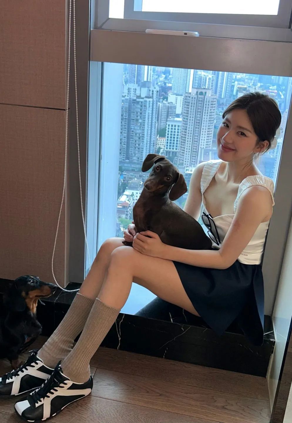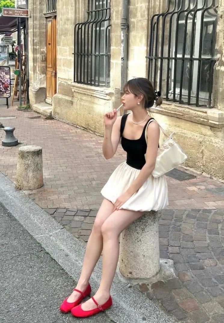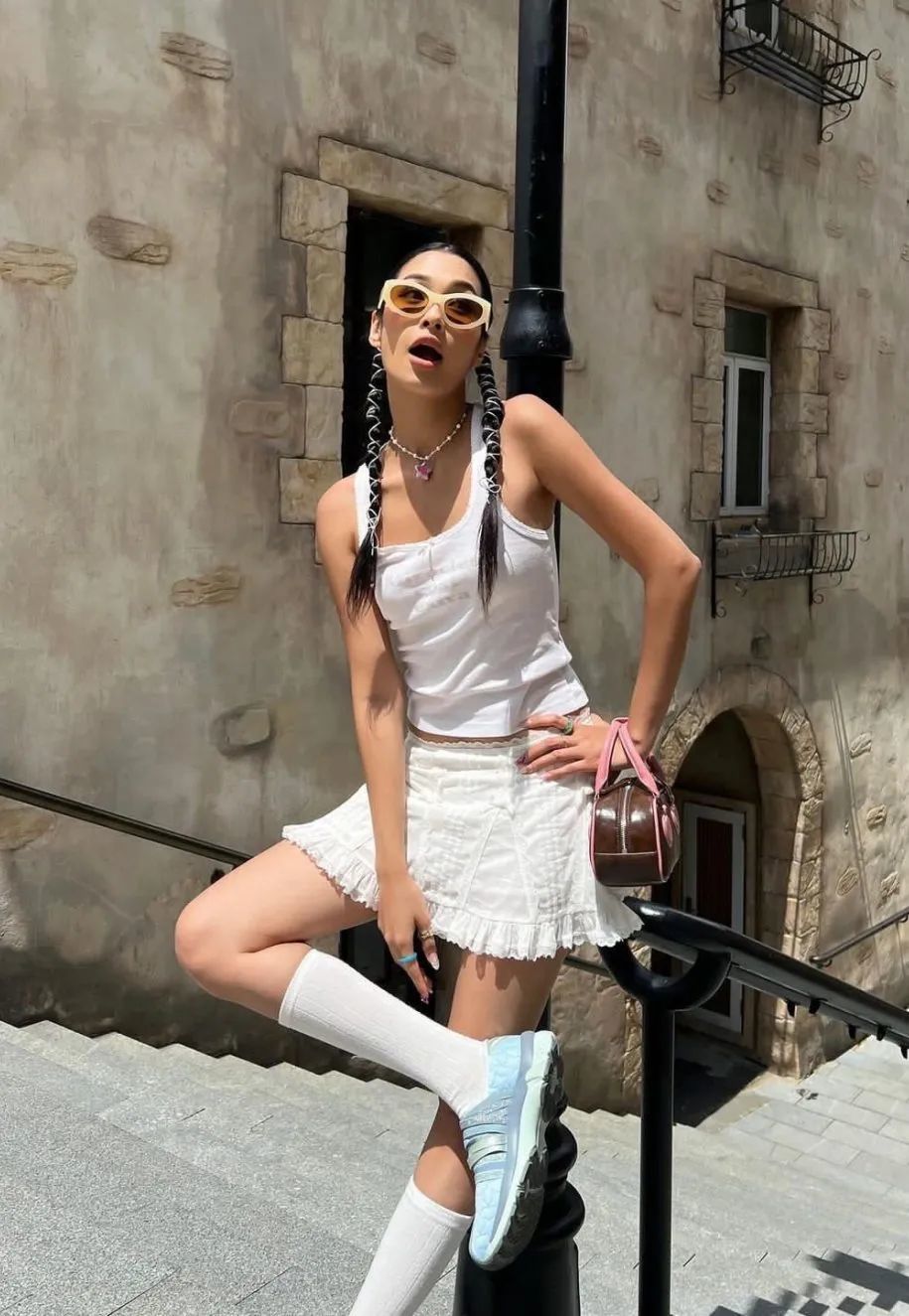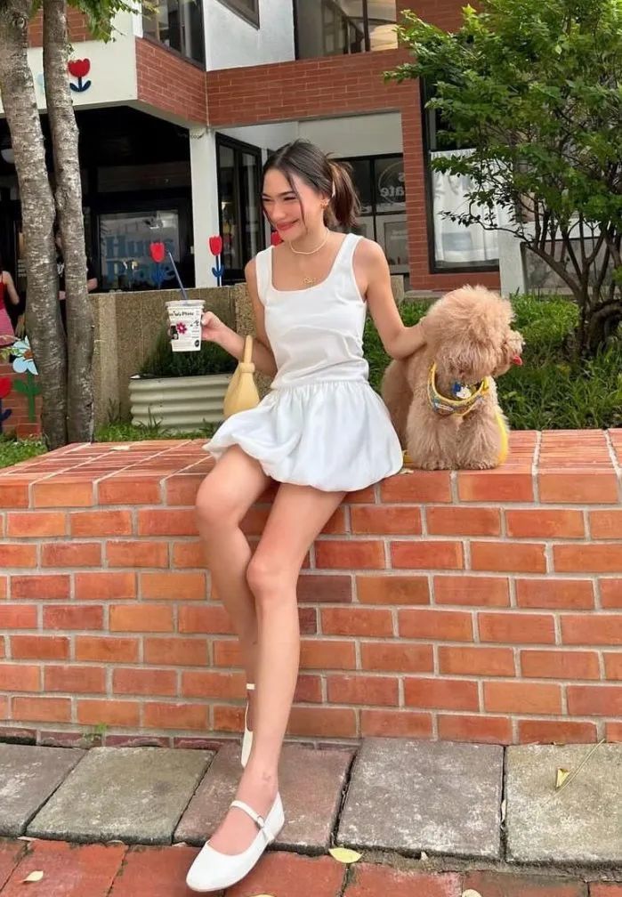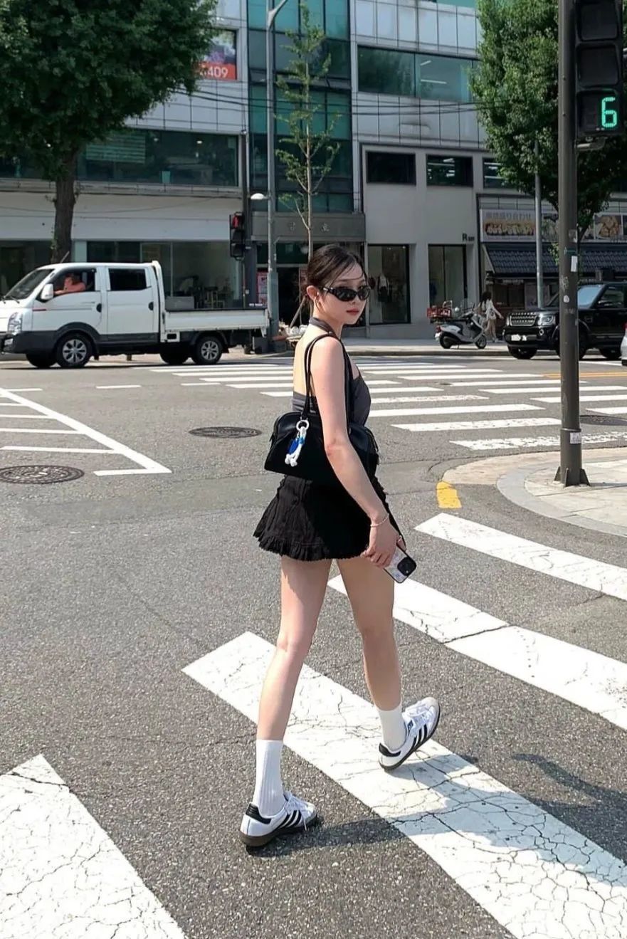 比如赵露思身上的这件无袖吊带上衣,经典的白色搭配深色半裙和黑白经典球鞋,少女优雅又俏皮的气质雀跃而出,在一众的穿搭造型中让人眼前一亮。