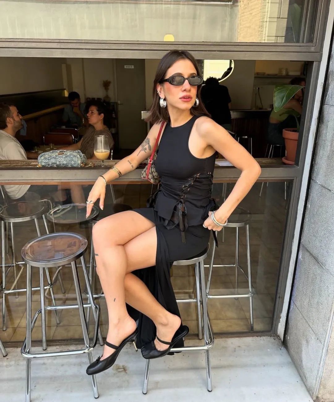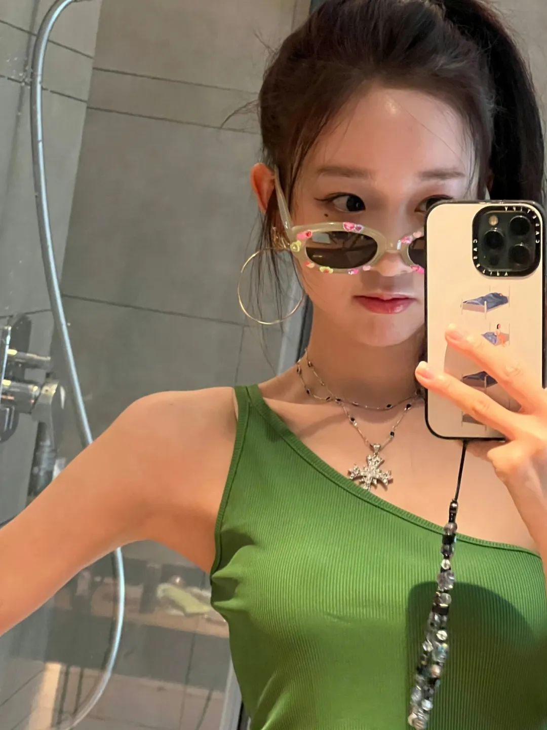普通方式穿吊带有时真的古板又无聊,但在吊带设计上花点小心思就会变得很不一样。李子璇身上这件绿色吊带只保留了一侧肩带,胸前的斜线设计增添了线条美,整体看上去增色不少。