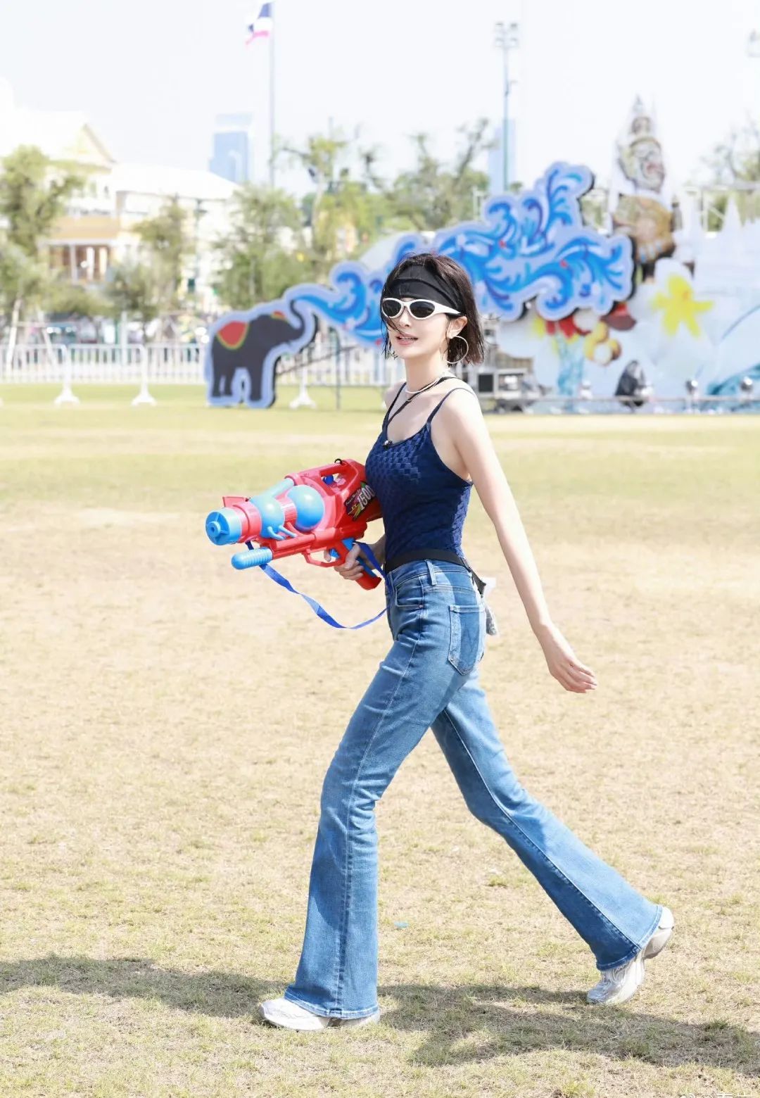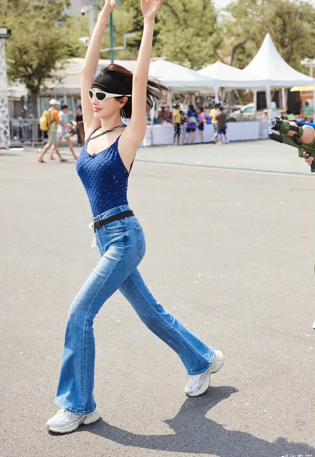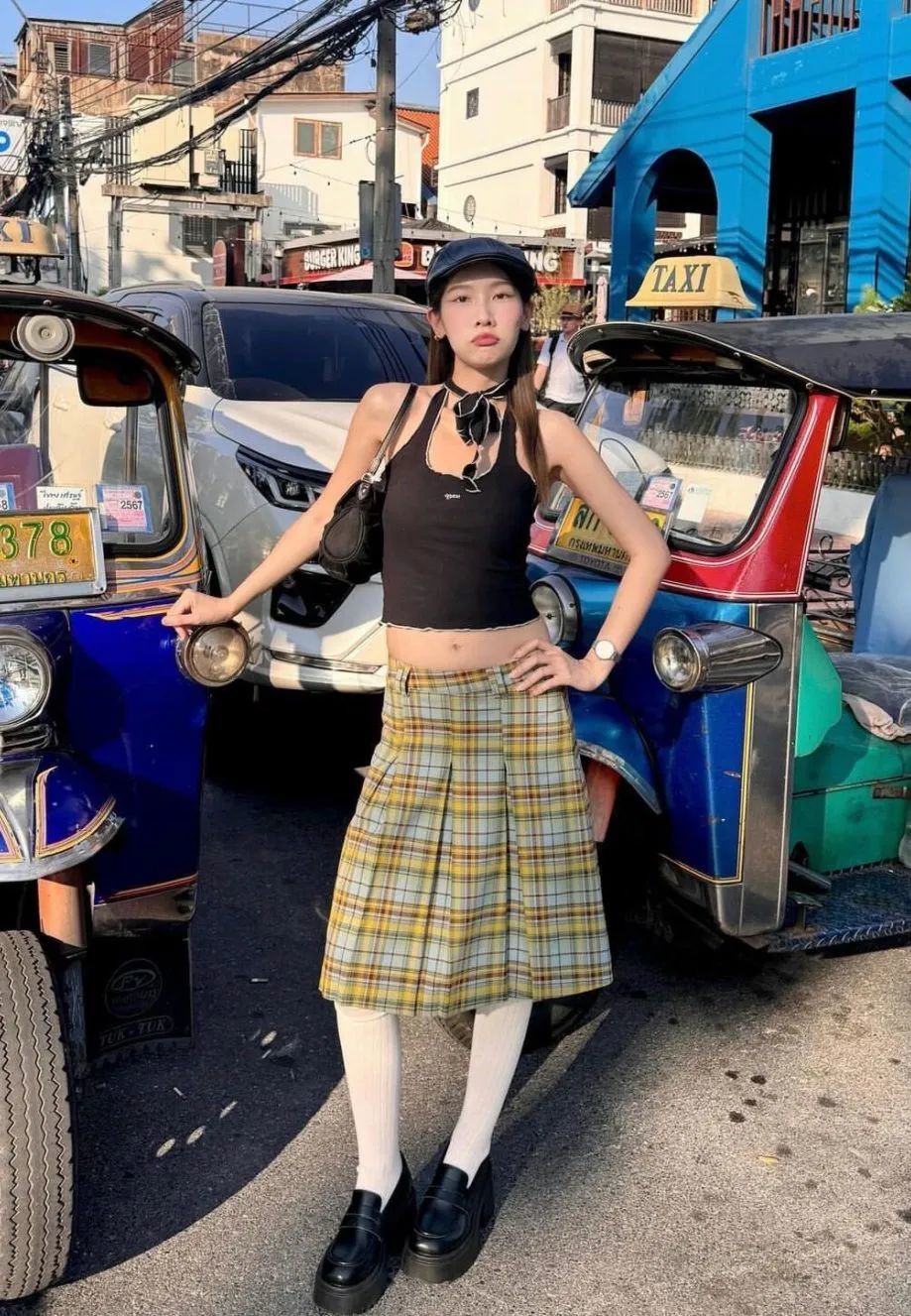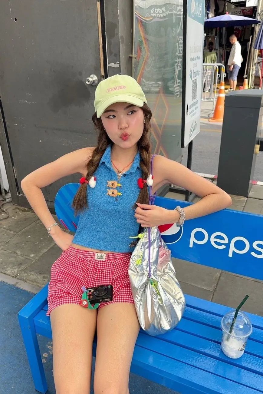 电音朵拉秦岚这套户外造型青春又活力,藏蓝色格纹吊带和微喇牛仔裤都十分修饰身形,兼具舒适感和运动属性,举手投足间时刻都透露着高级的小性感。
