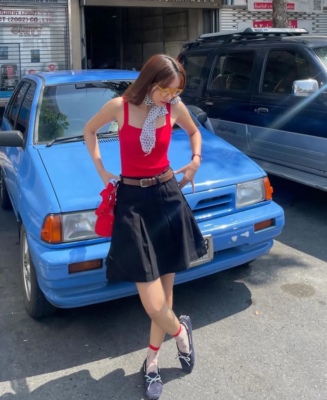 想要增加造型亮点,除了把颜色穿上身,也可以在颈部增加一条波点丝巾来点缀,真的能一秒变身复古女郎。