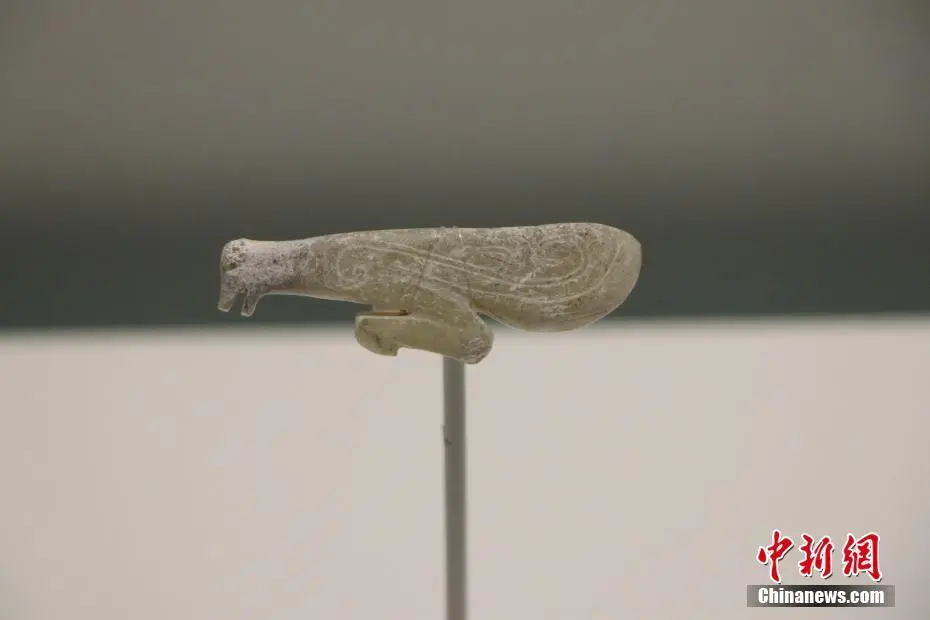 8月25日,在位于河南安阳的殷墟博物馆内,精美的玉器、骨器、青铜器吸引游客观赏。这些文物出土于安阳市殷墟宫殿宗庙遗址,距今已3300多年,是用玉和动物的骨、角、牙等制成的生活用器、生产工具、乐器、装饰品、雕刻艺术品等,其雕工精细,形态逼真,方寸之间可洞察商代匠人的“工匠精神”。图为鸟形骨刻刀。李海珠 摄