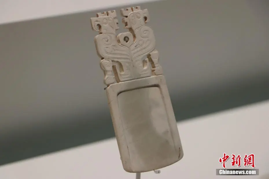 8月25日,在位于河南安阳的殷墟博物馆内,精美的玉器、骨器、青铜器吸引游客观赏。这些文物出土于安阳市殷墟宫殿宗庙遗址,距今已3300多年,是用玉和动物的骨、角、牙等制成的生活用器、生产工具、乐器、装饰品、雕刻艺术品等,其雕工精细,形态逼真,方寸之间可洞察商代匠人的“工匠精神”。图为玉柄形器。李海珠 摄