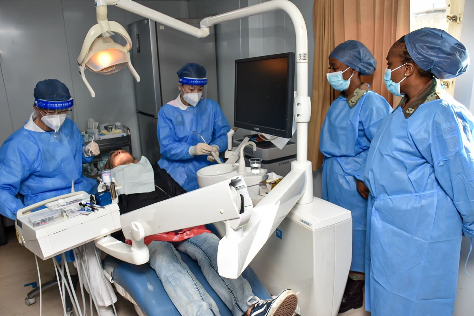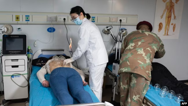 报道描述道,在一名中国医院工作人员的指引下,病人们排起了长队。在一间诊疗室里,两名患者在接受缓解疼痛的背部拔火罐治疗;另一间诊疗室中,一名病人正在接受牙科治疗。